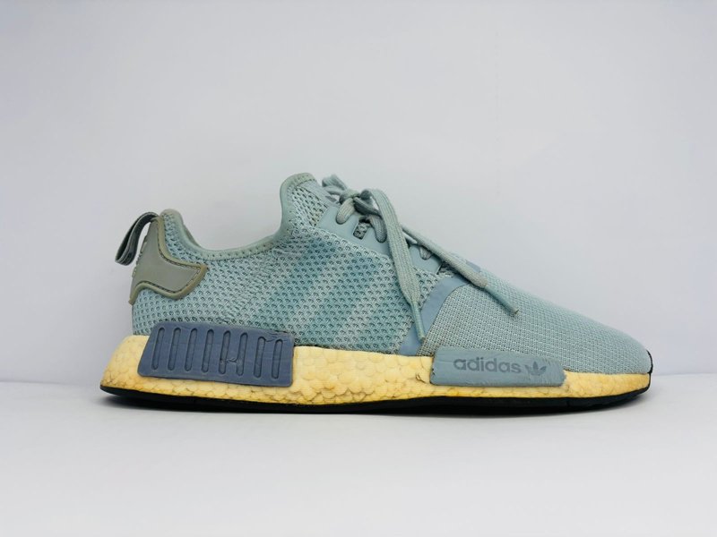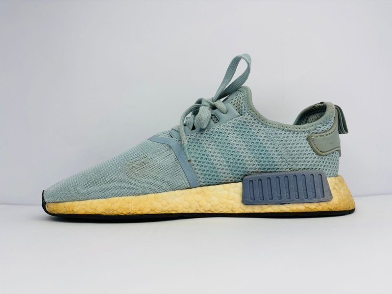 The Adidas NMD_R1 is a true streetwear icon, blending ’80s racing heritage with innovative, modern technology. This specific pair features a versatile light blue/grey knit upper and signature BOOST cushioning in the midsole, providing responsive, all-day comfort. The distinctive midsole plugs add to its unique aesthetic, while the aged, yellowed effect on the sole gives it a vintage, well-loved look that makes it stand out.